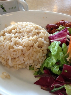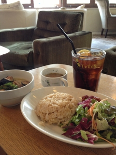 ご飯は玄米で、オニオンスープ、サラダ、ドリンクも
